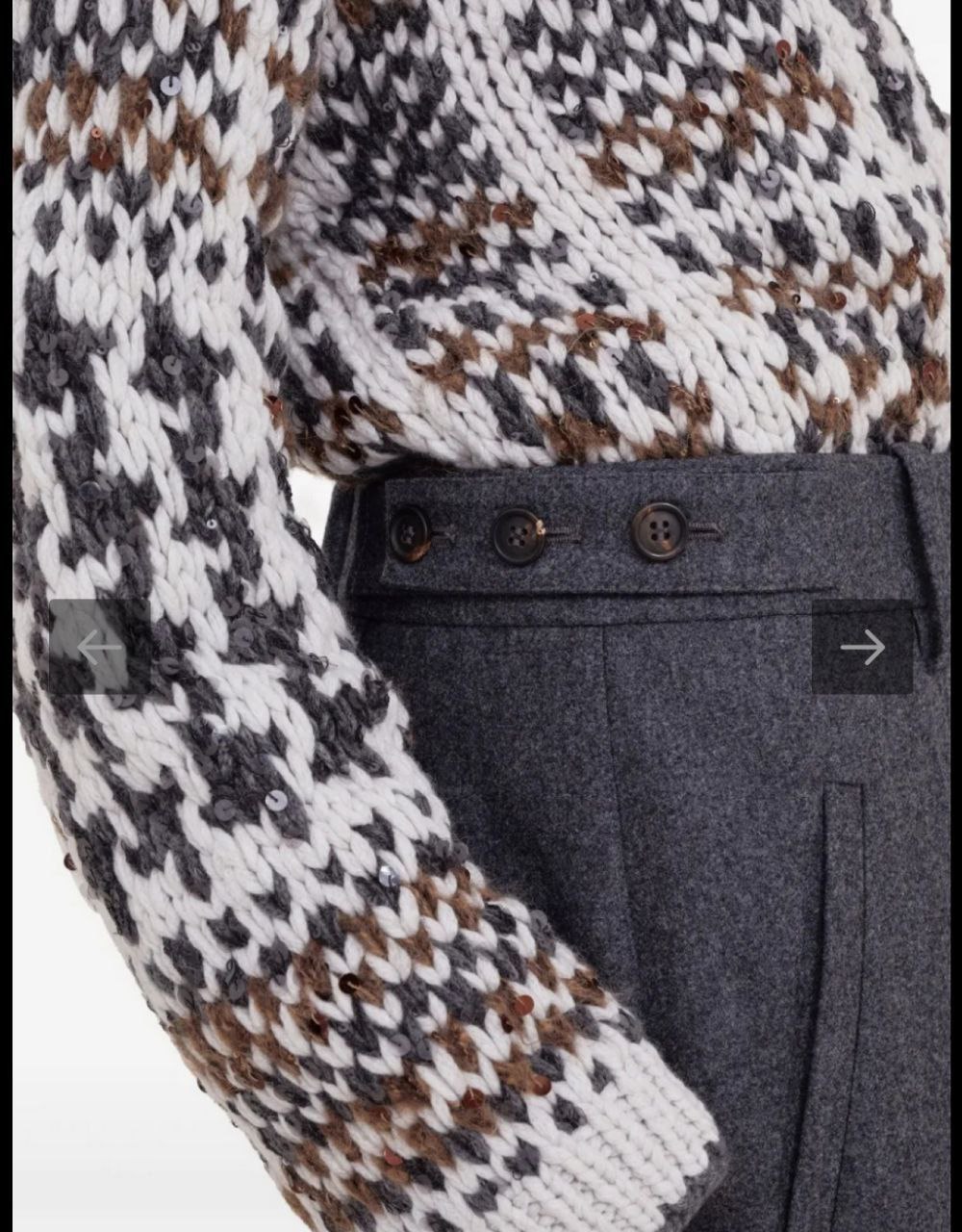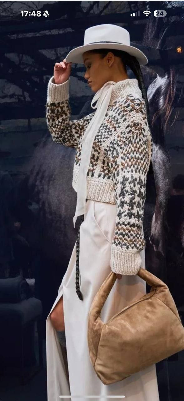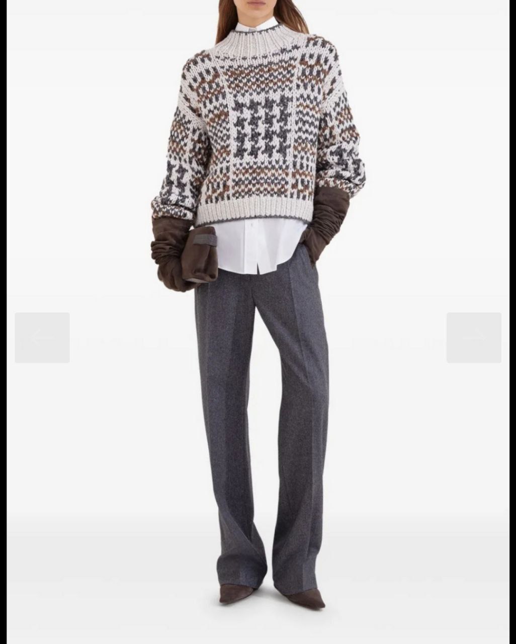 Этот джемпер — идеальный пример современного люксового casual в духе Brunello Cucinelli. Описание:Объёмный укороченный джемпер, выполненный из плотной фактурной пряжи с выразительным жаккардовым узором. Рисунок сочетает классический мотив «гусиная лапка» и геометрические элементы в мягкой палитре: кремовый, серый, бежевый и шоколадный. Такая комбинация оттенков делает изделие универсальным и лёгким для сочетания с базовым гардеробом.…